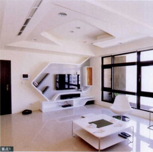偌大的空間以白色為主色,避免空間過于單調(diào),設(shè)計師特別設(shè)計了個性化的電視柜,并以對稱的天花板作為呼應(yīng),成為空間視覺的焦點。造型別致的電視培與客廳的簡約茶幾沙發(fā)相搭配為我們營造一個簡約又不失時尚感的客廳。