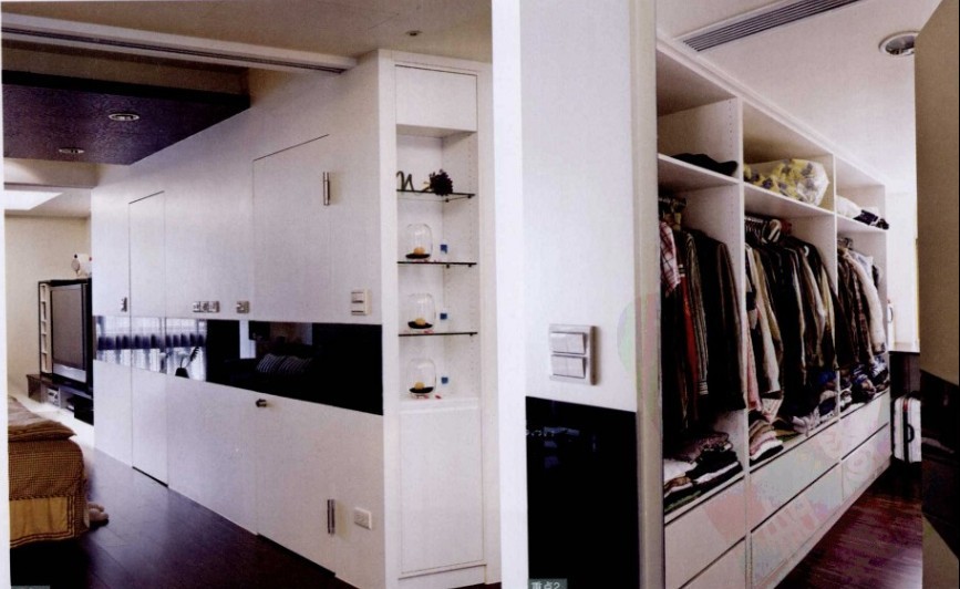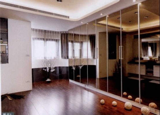 茶色鏡面門片的衣柜,不僅可以讓空間擴(kuò)大,還可以將無法避開的結(jié)構(gòu)柱隱藏其中,利用隱藏式門片設(shè)計(jì),將收納功能充足的更衣室隱藏其中,空間既具整體感,也有美化的效果,適度使用整體家具,再搭配木作嵌入黑鏡的門片收邊,可以有效降低裝修預(yù)算。