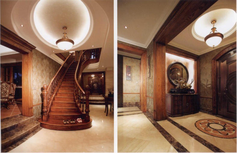 本案是帶有南、北兩個(gè)室外花園的獨(dú)棟別墅,是專為成功且品位高雅的人士量向定制的。此案的空間定為美式風(fēng)格。便捷、隨意、休閑是美式家居的特色,因此,在整個(gè)環(huán)境的設(shè)計(jì)中,應(yīng)該避免刻意的裝飾,并強(qiáng)調(diào)合理的交通流線,以保證不同功能布置的實(shí)用與方便。為了豐富空間的層次和展現(xiàn)空間的文化積淀,設(shè)計(jì)師在材質(zhì)上選用的都是仿舊、仿古系列。