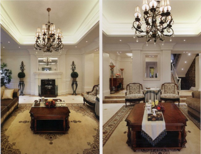概要: 具有美式經(jīng)典造型的墻板被設(shè)計(jì)得大氣磅礴,與頂棚的跌級造型渾然一體,再賦以純凈的白色,使空間格調(diào)顯得端莊而素雅。 一層面寬為12。3m的通透大堂采光非常好,大堂內(nèi)配置一些美式經(jīng)典家具及雅致的飾品,使得室內(nèi)環(huán)境頗具內(nèi)涵與品位。大堂的地面為淺咖啡色網(wǎng)紋與西班牙米黃色天然石材的并花鋪貼,而客廳與餐廳的地面則點(diǎn)綴美式手工羊毛塊毯,不僅強(qiáng)調(diào)了純正的美式風(fēng)格,而且又軟化了硬質(zhì)的空間。