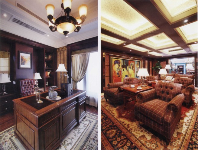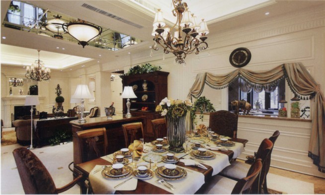 一層面寬為12.3m的通透大堂采光非常好,大堂內(nèi)配置一些美式經(jīng)典家具及雅致的飾品,使得室內(nèi)環(huán)境頗具內(nèi)涵與品位。大堂的地面為淺咖啡色網(wǎng)紋與西班牙米黃色天然石材的并花鋪貼,而客廳與餐廳的地面則點(diǎn)綴美式手工羊毛塊毯,不僅強(qiáng)調(diào)了純正的美式風(fēng)格,而且又軟化了硬質(zhì)的空間。射燈、工藝吊燈以及裝飾性臺燈等多種照明方式,共同構(gòu)成了立體的照明系統(tǒng),使得空間內(nèi)的光環(huán)境層次格外鮮明,既保證了燈具本身的裝飾性,也為夜晚的人工照明提供了足夠的照度及獨(dú)特的光效。