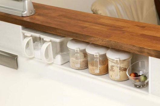 廚房內(nèi)側(cè)同外側(cè)一樣可以打造成內(nèi)嵌的隱形儲物格,經(jīng)典的透明材質(zhì)的調(diào)料罐隨意的擺放其中,既方便料理時拿取,又不讓一絲空間得到浪費。