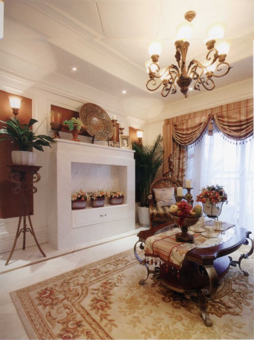 美式風(fēng)格,通常運(yùn)用在別墅或是大戶型的住宅空間中。本案中,設(shè)計(jì)師要將美式的浪漫進(jìn)行到底。起居空間采用簡(jiǎn)化了的美式線條造型墻,與頂棚的造型線框渾然一體,覆以純凈的白色,使居室顯得更加明亮。金棕色的裝點(diǎn),使空間格調(diào)端莊、雅致。再搭配美式經(jīng)典家具及精致的擺件,共同打造了頗具獨(dú)特內(nèi)涵與品位的居室空間。地面為西班牙米黃色石材結(jié)合咖啡色網(wǎng)紋波導(dǎo)線的拼花鋪貼,并在客廳與餐廳的功能區(qū)域點(diǎn)綴美式手工羊毛工藝塊毯,從而強(qiáng)調(diào)了純正美式風(fēng)格,也柔和了空間氛圍。鐵藝桌椅、石材壁爐、絨布美式沙發(fā)、鐵藝花臺(tái)、琳瑯滿目的的擺件及盆栽等多種元素的混搭營(yíng)造出精致場(chǎng)景,仿佛讓人置身好萊塢文藝片的唯美劇情之中。