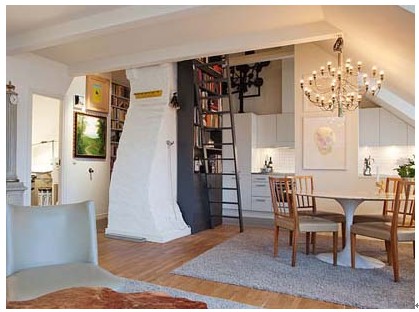空間不大的小家里融合了極簡(jiǎn)風(fēng)格的設(shè)計(jì),將廚房、餐廳和閱讀角打造于一體。通天的書架劃分出物質(zhì)和精神食量?jī)纱髤^(qū),家具深淺色調(diào)的變化為白色空間帶來(lái)一絲新意!整體看起來(lái)很溫馨!