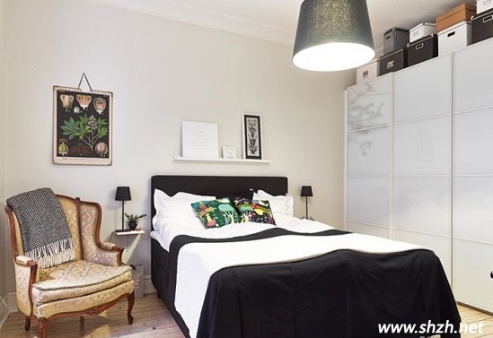 床頭墻壁上的水粉風(fēng)景裝飾畫將大自然帶進(jìn)了臥室,和墻壁上擱板上擺放黑白色調(diào)的裝飾品很和諧的形成了一處風(fēng)景。臥室的地板采用的是最原始色的木材地板鋪成的,我們可以看到樹木自然的紋理都被保留了下來,使我們?nèi)谌肓舜笞匀坏膽驯?,并且仿佛還能聞到樹木散發(fā)出的清香氣味,給人舒適、清新、快樂、溫馨的感覺,臥室的這種裝飾便于提高我們的睡眠質(zhì)量。白色的衣柜邊上有淡淡的樹枝暗影,很特別的設(shè)計(jì),像是從那副風(fēng)景畫上倒影過來的,給人一種身處林間,光影交錯(cuò)的錯(cuò)覺感。