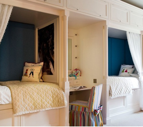 為了節(jié)約空間,在靠墻的地方放下了兩個(gè)用梳妝臺(tái)隔開的床位的衣柜。雖然看上去有點(diǎn)窄,但是能把更多的空間留給孩子玩了,兩個(gè)小女孩公用一個(gè)梳妝臺(tái),但是都能擁有自己獨(dú)立的床。