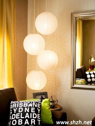圓形的頂燈線條分明,且結構簡單。用棉布纏繞后這個球狀造型,高低不同而錯落有致的懸掛在沙發(fā)區(qū)頂部,搭配上客廳里同樣以棉質(zhì)為主的布藝靠包,將樸實無華的自然主義情節(jié)展露無遺。