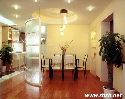 廚房是家庭“工作室”,較為明亮的散射燈光可使廚房顯得更為寬敞、整潔。廚房通常采用吸頂或吊燈作一般照明,并在操作臺的上方設置嵌入式或半嵌入式散光型吸頂燈??紤]到廚房油煙和水汽比較重,與其他房間的燈具相比,廚房燈可能經(jīng)常需要拆洗,所以應盡量以簡潔為主,燈具材料也以塑料和玻璃為佳,以方便清潔。若廚房兼做餐廳,光源宜采用暖色白熾燈。