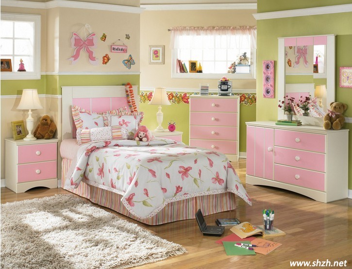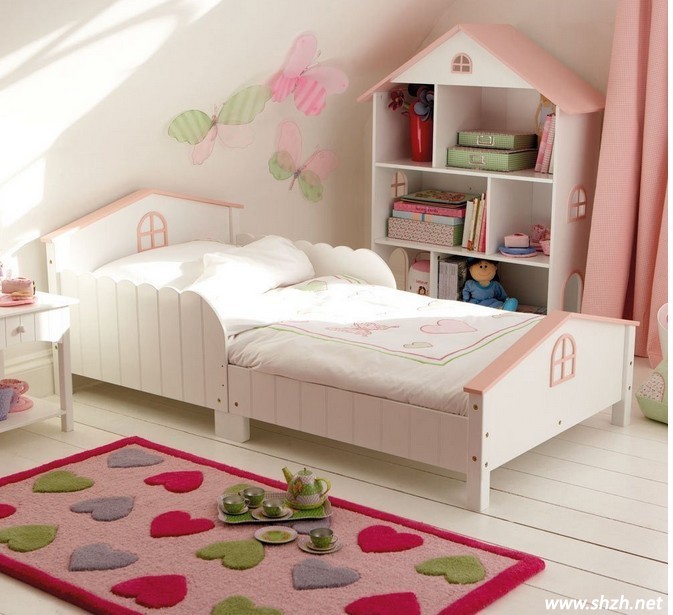 粉紅色始終是女孩子們的最愛,粉紅色布藝家具給兒童房營造了唯美浪漫的氣氛,粉紅色屬于暖色調(diào),有利于培養(yǎng)孩子善良溫厚的性格。床邊鋪設的地毯也是別有風味,上面紅綠兩種顏色的心形突出小女孩的愛浪漫的心理,白色的田園風格的床讓孩子在睡夢中也會身處于美麗的大自然,擁有好的睡眠。