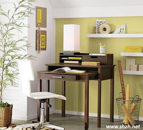 選擇一角放置幾塊簡單實用的隔板,再選擇一款有木質(zhì)紋路的小書桌,用草綠色的墻紙,將這個角落改造成一個清新的小空間。我們所選的書桌雖然小小的,但它的神奇之處在于它可以伸縮自如,對于小戶型的空間來說真是一件寶貝;帶抽屜的小書桌閑暇之余還能存放手機(jī)、MP3等等日常的用品。另外這款書桌還可以搭配擴(kuò)容架,讓功能更強(qiáng)大。