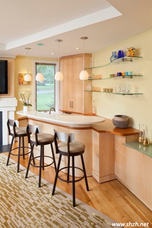 四:轉(zhuǎn)角式吧臺(tái)。設(shè)計(jì)要點(diǎn):苦于沒(méi)有多余的地方來(lái)安放吧臺(tái)的話,你家的房間轉(zhuǎn)角部位也是個(gè)不錯(cuò)的選擇,只要你安排的合理,不僅可以讓你的居室看起來(lái)整齊緊湊,而且有客人來(lái)訪的時(shí)候圍著吧臺(tái)而坐,非常方便。