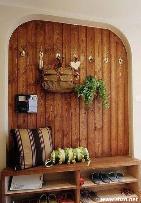 這款設(shè)計(jì),有沒有給你一種返璞歸真的感覺?整個(gè)玄關(guān),充滿著大自然的清新。木質(zhì)打造的鞋柜,隨意的擺放常穿的拖鞋。純木質(zhì)制作的背景墻,釘上掛鉤,配合著綠色的吊蘭,鄉(xiāng)村氣息十分濃厚。