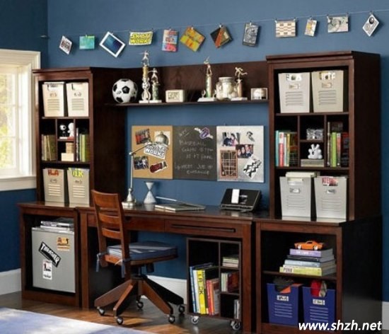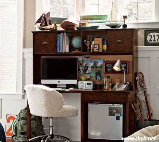 這款設(shè)計,線條一點也不繁瑣,簡單實用是它最重要的闡釋。小格子里放置著一些畫冊、小魔方、鬧鐘等,簡約但卻不失其美觀性。這樣簡簡單單的裝飾,卻能讓自己眼前變得不單調(diào)。非常適合小男孩子使用哦!