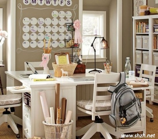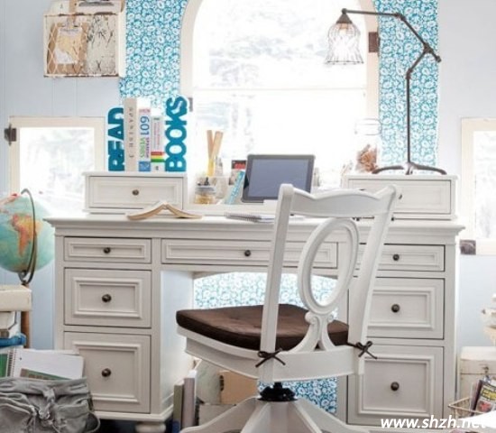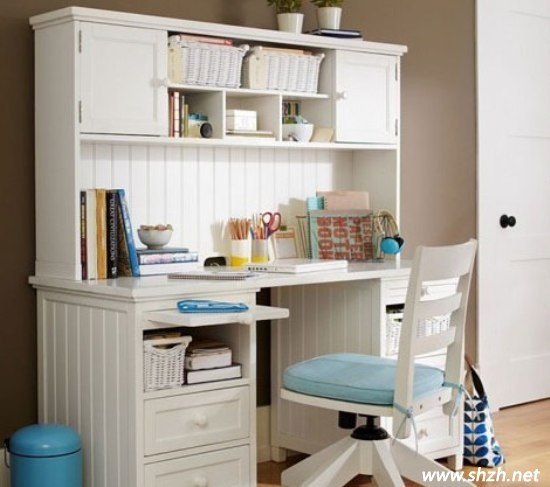 白色給人的感覺就是很單純可愛。這款設(shè)計,不管是造型還是色彩上,都配合得十分協(xié)調(diào)。白色提亮了整個空間的亮度,造型優(yōu)雅的書桌使整個空間都透露著優(yōu)美的感覺。收納格子中間懸掛著女孩子喜愛的裝飾品,非常的清新優(yōu)雅。從容淡雅的生活氣息,給孩子帶來了一份清新自然的情趣。