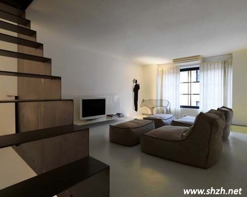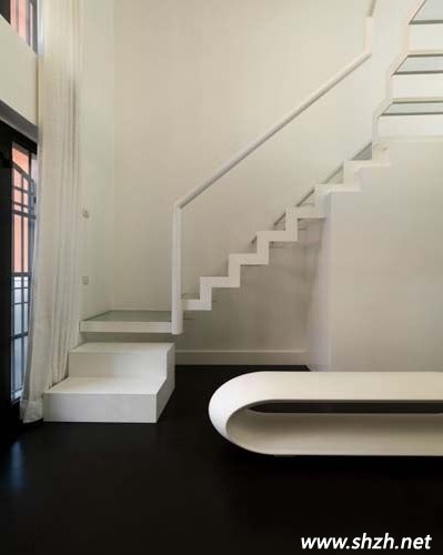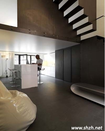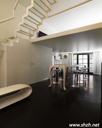 上海裝潢網(wǎng):圖一中的三幅是這個LOFT的第一樓,南北通透的房型最好布局了,設(shè)計師把廚房安放在進(jìn)門處,讓每一位來者第一時間感受到家的溫馨,轉(zhuǎn)身即到的餐廳中,餐桌采用吧臺的造型,時尚美觀,另外大家看見餐桌后的白色櫥柜了嗎?即使有很大的空間,設(shè)計師仍然沒有浪費(fèi)樓梯下的大好空間,在此打造了一個容量巨大的收納室。最后順著餐廳走過,一樓的另一端墻壁也完全打開,門外的陽臺也是一道風(fēng)景線。