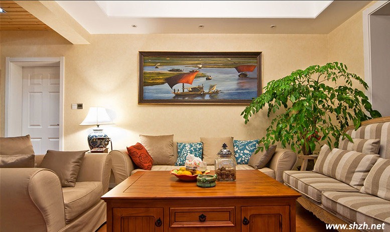 美式鄉(xiāng)村風(fēng)格摒棄了繁華和奢華,并將不同風(fēng)格中優(yōu)秀元素匯集融合,以舒適溫馨為導(dǎo)向,不論是笨重的家居,還是帶有歲月滄桑的配飾,無不在告知著人們“回歸自然的”品質(zhì)。我們來看這客廳的設(shè)計(jì),原木的電視柜、茶幾、地板,古典中帶著點(diǎn)隨意,兼具了古典主義的優(yōu)美造型與新古典主義的功能配備,簡潔明快,溫暖而舒適。而布藝又是美式鄉(xiāng)村風(fēng)格中非常重要的元素,這款米色的布藝沙發(fā),布藝的天然感與鄉(xiāng)村風(fēng)格進(jìn)行了完美的結(jié)合。而一旁的花卉綠植,舒適而隨意,濃烈的大自然韻味。