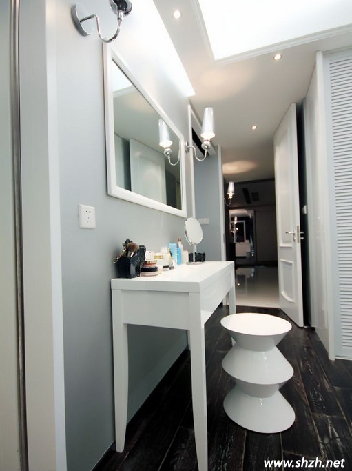 臥室與衛(wèi)生間之間僅用一面墻隔開,而中間則設置成一個梳妝臺,純白色打造,造型可愛的凳子給單調(diào)的空間帶來了許多的樂趣。黑色的木質(zhì)地板,莊重古典的氣質(zhì),古典與現(xiàn)代的完美結(jié)合,創(chuàng)造了一種意義的合成,一種立體的美學合成。