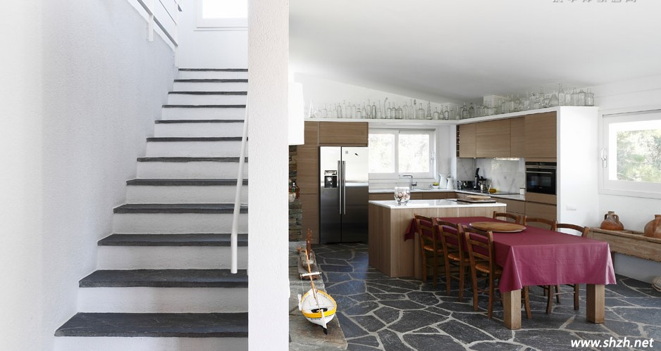 這里就是一樓了,整個空間全部打通,非常寬敞明亮,擴(kuò)大了視覺空間。而且白色本身就能給居室?guī)砻髁恋母杏X,大大的落地窗戶,從室內(nèi)可以直接欣賞到室外的美景,非常的愜意。而就餐的區(qū)域,實(shí)木的桌椅打造,很有異國的情調(diào),相信在這樣的一個環(huán)境下進(jìn)餐,一定會非常美妙舒適的。角落里用竹子編織的籃子,雖然不顯眼,卻格外的有情調(diào)。而就地取材的石頭材質(zhì)拼湊成地面,與戶外環(huán)境好不費(fèi)力的融合在一起,更加的貼近自然。