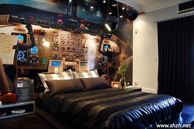 我們看這款設(shè)計,可以感覺得到業(yè)主對飛機(jī)的熱愛到了癡迷的程度,整個臥室被改造成了駕駛艙,而床頭背景墻的設(shè)計更是成為了居室的點睛之筆,各種方向盤的設(shè)計,在燈光的照耀下,顯得溫馨而舒適,睡在這樣一個臥室空間,整個人就好像漂浮在空中一樣,特別的悠閑自在。整個空間的色彩并不艷麗,中性的色彩更凸顯出時尚奢華的感覺。