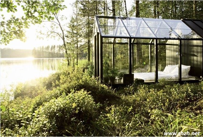 全透明的玻璃臥室設(shè)計。整個臥室被純天然的自然風(fēng)景所包圍,讓居室內(nèi)邊的十分清新自然。玻璃打造的墻面,使得采光效果非常的良好,這樣的設(shè)計,一定要是隱蔽的地方,不然業(yè)主的一舉一動都被曝光。所以,這款設(shè)計,算得上是比較罕見的設(shè)計了。
