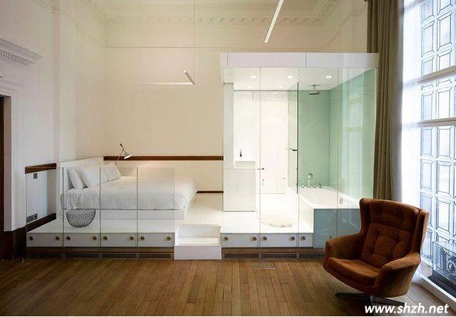 舞臺造型的臥室設(shè)計,看似開放式的空間,其實用了玻璃作為隔斷,而且還設(shè)置了白色地臺,巧妙的將各個功能區(qū)域明顯的區(qū)分了開來。衛(wèi)浴間的設(shè)計很美妙,整個區(qū)域就像一個舞臺,淋浴時還能再此高歌一曲,讓自己變得自信滿滿。