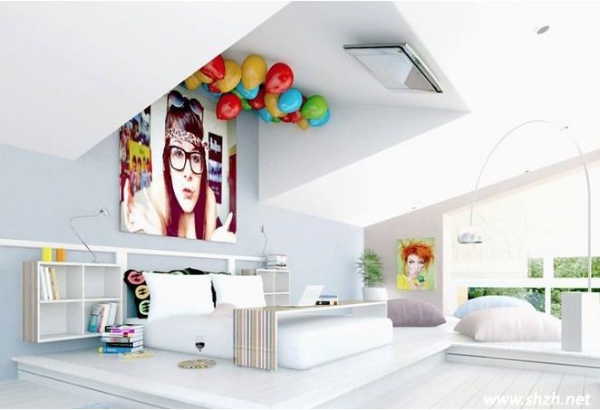 也許,一看到這個設(shè)計,你也一定會很驚訝,電視機(jī)居然被掛到了天花板上,讓純白單調(diào)的天花板變得不再寂寞。臥室背景墻的設(shè)計,彩色的氣球給整個區(qū)域增添了許多亮麗的色彩,而且臥室空間變得趣味十足,不再單調(diào)乏味。
