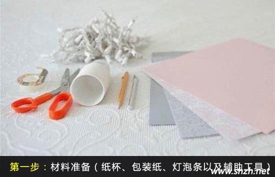 第一步,材料準(zhǔn)備。包括:一串彩燈、收集回來的一次性紙杯、各式包裝紙以及鉛筆、剪刀等輔助工具。(注意:包裝紙不適合采用過厚的紙張哦,選取輕薄透光的紙張為宜)