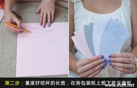第三步,扇形的包裝紙剪下來之后,在每張包裝紙的寬度一側(cè)黏上雙面膠。然后一個(gè)個(gè)圍繞著杯子的側(cè)面輕輕地卷起來。