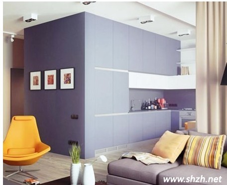 和客廳設計在一起的廚房空間,將沙發(fā)后方的空間全部利用起來。在客廳和廚房之間用簡單的布簾當成隔斷,煮飯烹飪時可以拉上放置油煙飄出,廚房空閑時拉開,能保證整個空間視野的開闊感。廚房和整個墻面連成一體,紫色和白色相間的搭配將整個廚房都變的優(yōu)雅非常。