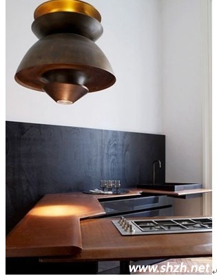 其實廚房空間還是比較規(guī)整的,但是主人卻將整個櫥柜和操作臺面進行了不規(guī)則處理,層層疊疊的柜面增加了整個空間的層次感,打破了普通空間的中規(guī)中矩感。半墻黑色半墻白色的搭配也讓整個廚房空間變的很經典,棕色的櫥柜店主其間,也讓整個廚房變的很典雅有氣質。