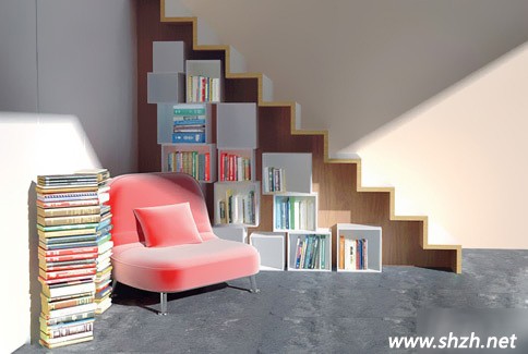 不管利用與否,樓梯始終會占據(jù)一定空間。顯然,它屬于開拓收納再合適不過的新渠道。收納的方式可以多種多樣,開放式、隱蔽式、裝飾點綴式等等,具體可以結(jié)合房間結(jié)構(gòu)以及個人愛好進行設(shè)計,將它變成知識的海洋。