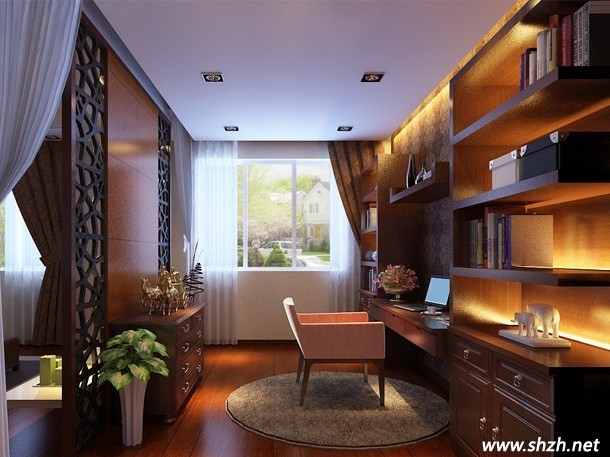 概要: 書房,也可以稱作居家工作室,是私人的讀書、學(xué)習(xí)、工作空間。書房的基本設(shè)施是桌、椅及書柜等。開放式書房是將書房通過裝飾與其他房間進(jìn)行分隔,開放式書房一般出現(xiàn)在中小戶型,因?yàn)闆]有足夠的空間單獨(dú)用作書房,只能在客廳或臥室分隔出一塊區(qū)域。因此,考慮到對(duì)于空間的利用問題,必須做到用品少而精,還要保證足夠全面,所以就需要充分合理的利用每一寸空間。除此之外,開放式書房的光線以及隔音效果也是重點(diǎn)。