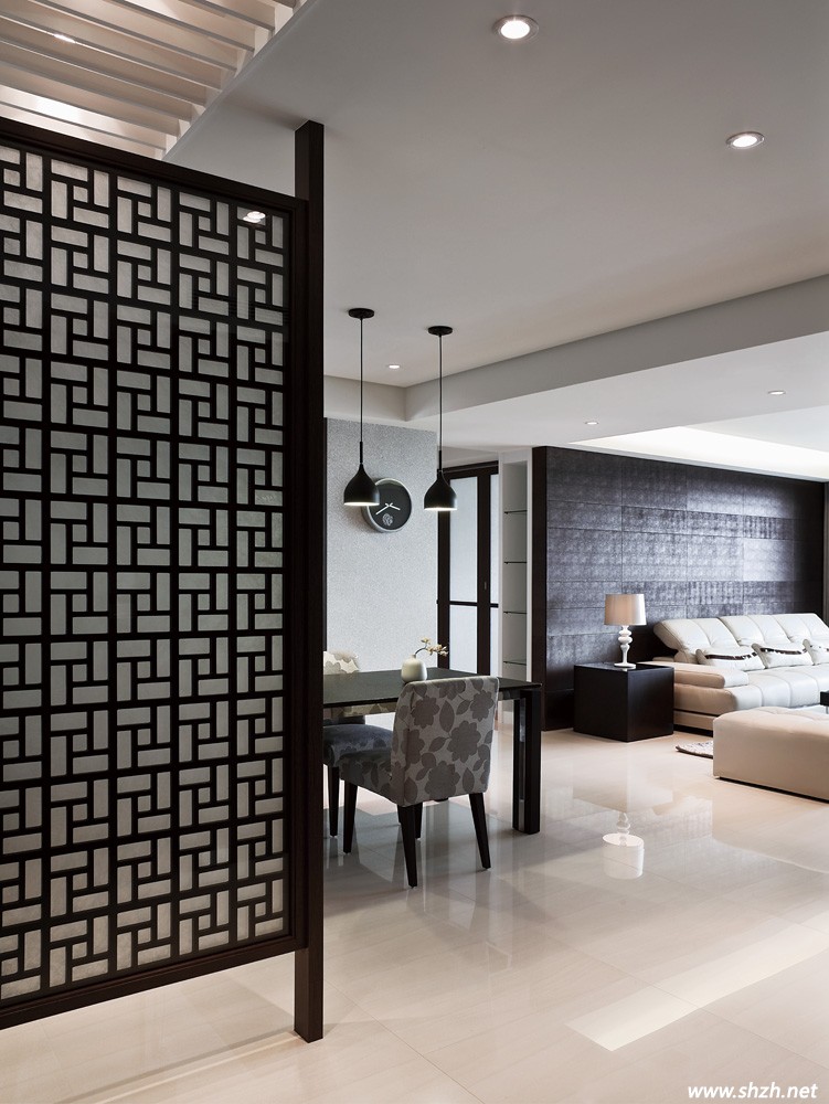 小編從這套案例中的客廳來剖析,設(shè)計(jì)師為了回應(yīng)窗外的湖光水色,特地以新東方設(shè)計(jì)為內(nèi)涵,為現(xiàn)代舒適的空間格局中,展現(xiàn)出更為深刻的感動(dòng)。在現(xiàn)代的空間線條與家具中,設(shè)計(jì)師刻意安排黑與白的對比配色,讓絕對現(xiàn)代風(fēng)格的空間色塊,有如水墨畫般地運(yùn)用水色的濃淡來加以渲染,頓時(shí)之間,喧嘩被吞噬了,心情被撫平了,空氣之中僅剩一股清新的明亮。而在此時(shí),若有似無地穿插其間的東方線條,如玄關(guān)屏風(fēng)、如走道端景、如餐桌上的一枝飛舞蘭影,都像是能挑起思古幽情般地牽動(dòng)著居住者的情緒,讓人對于居家更多依戀。