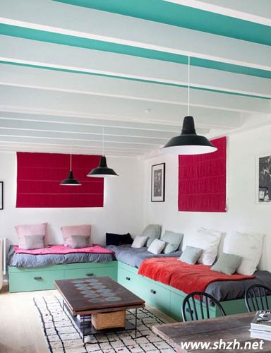 臥室是休息的重要場(chǎng)所,人的一天1/3的時(shí)間是在床上度過的,因此,臥室一定要以溫馨舒適,能有助于人的睡眠為主。這款設(shè)計(jì)就特別的簡(jiǎn)單溫馨。淡綠色;與白色相搭配就是挺不錯(cuò)的視覺效果。而且映入眼簾的床頭那一面不規(guī)則鏡子也是很有趣味的,裝飾效果非常好。