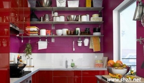 這是色塊大量運用的空間,紫色與紅色的完美搭配,整個空間變得更加嫵媚動人。墻壁上隔板打造,擺放各種廚房用具,也是空間的一大亮麗風(fēng)景。使得整個空間就像一個展覽區(qū)一樣,各種產(chǎn)品任意挑選,盡情享受進餐的樂趣。