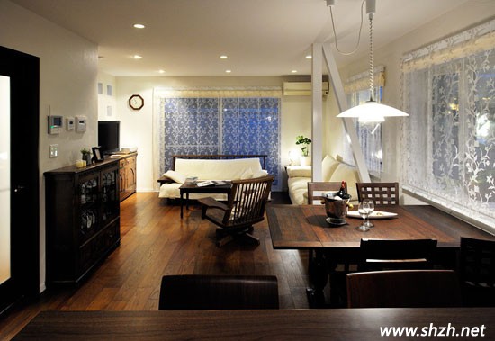 日式風格設(shè)計喜歡采用原木裝扮家居,非常特近大自然的生活環(huán)境??蛷d的設(shè)計,一眼忘去映入眼簾的則是深木色的地板,紋理清晰可見,自然氣息濃厚。同樣餐桌也是采用原木作為材質(zhì),整個空間不僅搭配和諧,還具有立體感。但是,居室的其它區(qū)域,卻明顯的呈現(xiàn)出現(xiàn)代時尚的感覺。比如白色的布藝沙發(fā),顯得干凈整潔,寬敞舒適,使得單一的空間有了一絲時尚的味道。窗簾的選擇上也別具個性,鑲嵌白色的花紋,顯得更加的浪漫溫馨。