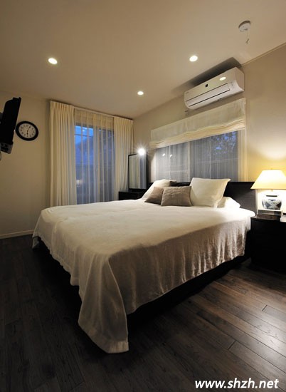 臥室并沒有做過多的裝飾,原木地板,簡樸大方。床品也很簡單卻非常溫馨舒適。同樣乳白色的窗簾,沒有過多的色彩裝飾,卻盡顯浪漫與恬淡。