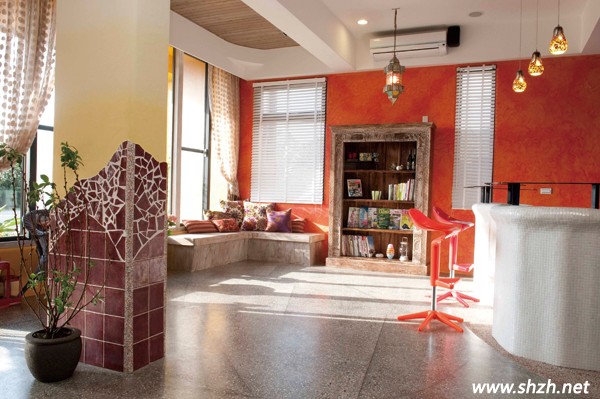 進(jìn)入民宿的第一眼便會(huì)看到這間橙橘色的大廳,瑰麗的色彩引爆心中的熱情,且讓暖陽的氛圍醞釀休憩的心情,搭配上深藍(lán)色的吧臺(tái)避免,令人直呼設(shè)計(jì)師對(duì)于空間用色的大膽。小巧的馬賽克吧臺(tái)是民宿主人吳大哥夜間最佳表演場(chǎng)所。