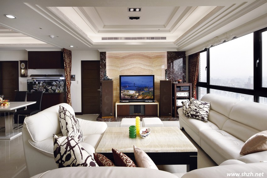 氣勢十足的公共空間為開放式規(guī)劃,客廳擺設(shè)著比例和諧、質(zhì)型俱佳的白色皮革訂制家具,視覺上不以制式的裝置元素切割平面,反而以更圓融純熟的手法營造連續(xù)面的整體美。氣勢恢弘的電視主墻中央同樣精選稀有的天然玉石精工打造,華麗而細(xì)膩的對花紋理,本身就是令人嘆為觀止的裝置藝術(shù),兩側(cè)搭配氣質(zhì)沉穩(wěn)的深金峰石材,運用色彩的深淺對比加強大面積量體的變化。避免繁復(fù)的裝飾線條喧賓奪主,僅在連續(xù)的落地大窗前方點綴局部藝術(shù)線板,帶出新古典特有的優(yōu)雅因子。