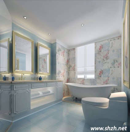 衛(wèi)生間就是很簡單的英式風格,在墻上依然使用的是碎花壁紙,淡藍色的瓷磚,與衛(wèi)生間整體白色一致,為了不使整個衛(wèi)生間看的過于單一,而將鏡子周邊鑲上金色的邊框彰顯英式的貴族氣息。