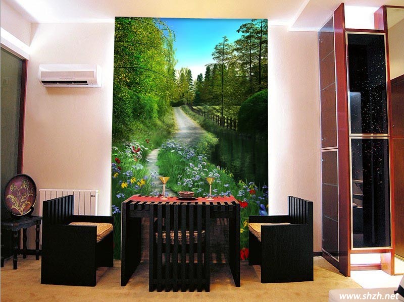餐廳的背景墻,一般人都是掛上個(gè)性的圖畫來裝飾,但是換上噴繪墻紙呢,效果又是兩樣的吧,在無形中開闊了餐廳的空間,綿延不斷的小道,鮮艷奪目的野花,綠色的樹木,都給餐廳增加實(shí)實(shí)在在的春色。