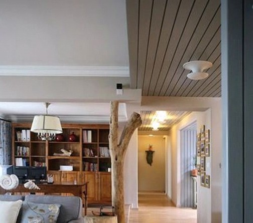 看這張圖片大家的第一感覺是不是是感覺這棵樹是不是有點像本不屬于這個空間,但是本案設計卻無獨有偶,把本不屬于空間的東西完美的安插在這個空間當中,走道的木質(zhì)格柵吊頂,休閑區(qū)域的成品書柜!完美的勾勒出了原生態(tài)溫馨家居的美!