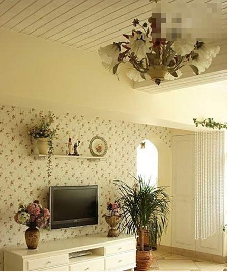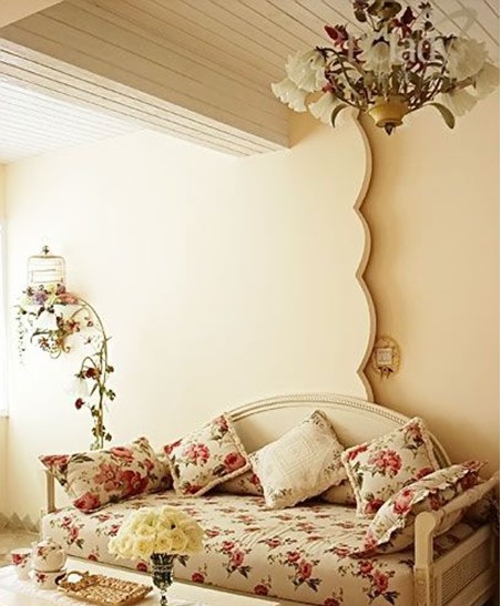 花瓣式的沙發(fā)背景透露了幾分甜蜜,給單調(diào)的白墻增添了不少分。用最小的投資打造最實(shí)用的效果。