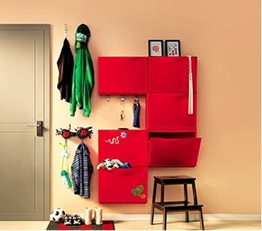 上方則專屬于是父母的儲物區(qū);另外,為了避免空間的浪費(fèi),在柜子中間空出的部分可以安裝一些小掛鉤,用來掛鑰匙或者雨傘等常用小物件。