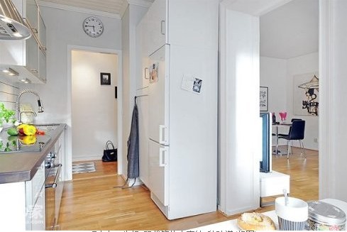我們再回到廚房里,白色的3門冰箱可以儲藏一些食物的材料。門框上的鐘時刻提醒著你注意時間,把食物烹飪出最佳的美味。半敞開式的廚房可以隱隱約約看到隔壁的客廳。