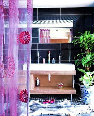冷調(diào)的粉紫是調(diào)情的高手,手工刺繡的雛菊?qǐng)D案在紫紗上若隱若現(xiàn),給沉悶的衛(wèi)浴帶來遐想,沉醉在這明艷的色調(diào)中,享受全身心的放松吧!來點(diǎn)綠植,大片的綠葉豐富了黑色瓷磚的層次,給浴室?guī)砹藷o限的生機(jī)。