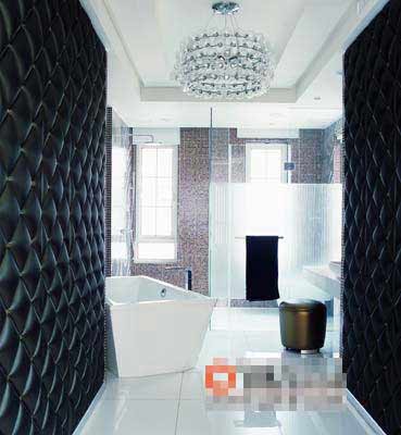 黑白是永恒的流行色,在這樣一個經(jīng)典空間里,就可以選擇設(shè)計風(fēng)格一致,但形態(tài)、色彩、質(zhì)感各異的家具。衛(wèi)生間干區(qū)的皮質(zhì)軟墻、濕區(qū)馬賽克的拼貼,造型感十足的玻璃質(zhì)吊燈以及線條明朗的潔具,它們都簡潔而富有張力,共同打造了一個質(zhì)感豐富的空間。