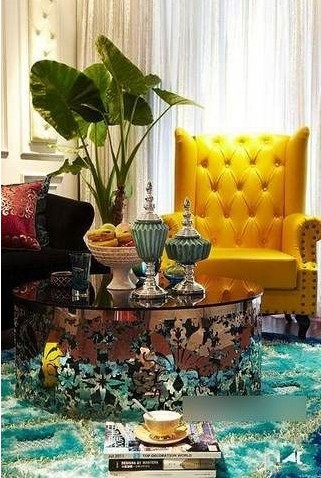 金黃色的沙發(fā),黑色的不銹鋼茶幾,特別的給力,視覺沖擊很強(qiáng)。