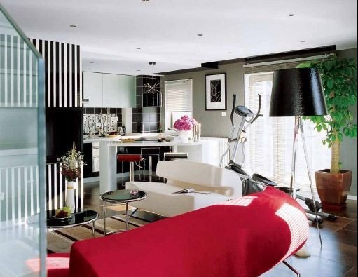 廚房間的吧臺(tái),時(shí)髦女郎男女居家中的最?lèi)?ài)。黑白插畫(huà)瓷磚,改變了黑白基調(diào)的沉默嚴(yán)肅,使房間變得輕松,浪漫。廚房這個(gè)沒(méi)有浪漫氣氛的地方也可以生出浪漫的感覺(jué)。