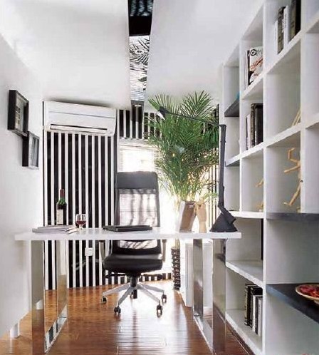 中戶(hù)型空間不大,所以在空間規(guī)劃上得特別細(xì)心??臻g小并不代表不精彩,一道轉(zhuǎn)墻的設(shè)計(jì)成為二層空間最大的亮點(diǎn)。分隔書(shū)房與臥室空間的是兩道半墻,其中一道可以自如旋轉(zhuǎn),關(guān)閉時(shí),兩個(gè)空間各自獨(dú)立,看電視的與看書(shū)的各不影響;而打開(kāi)時(shí),兩個(gè)空間相互貫通,隔離而不疏離。